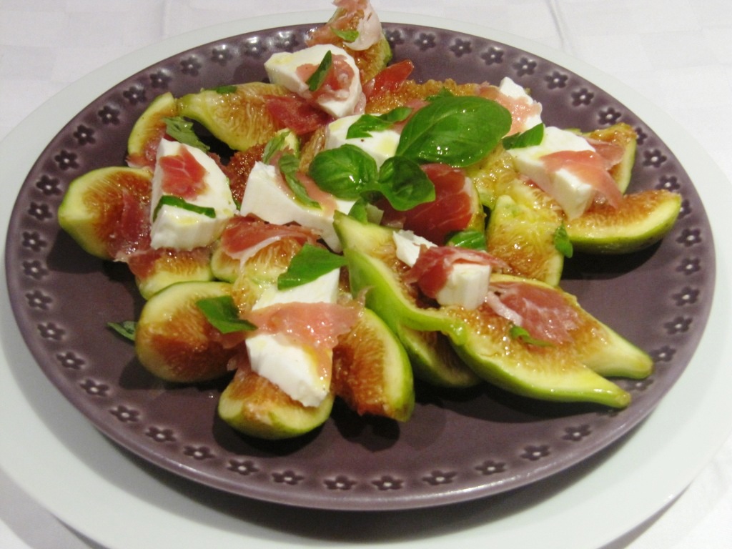 Fazer um corte em cruz nos figos, da parte mais estreita para a parte mais bojuda, sem ir até ao fundo. Abri-los, empurrando por fora, com os dedos, a base do figo para cima, expondo o interior. Colocá-los num prato. Espalhar, nomeadamente por entre as reentrâncias dos figos, pedaços de presunto e queijo. Misturar os ingredientes do molho numa taça, mexer bem e verter por cima da salada. Aromatizar com as folhas de manjericão, partidas grosseiramente. Acompanhar com pão, que pode servir para molhar no líquido delicioso que sobra no final...