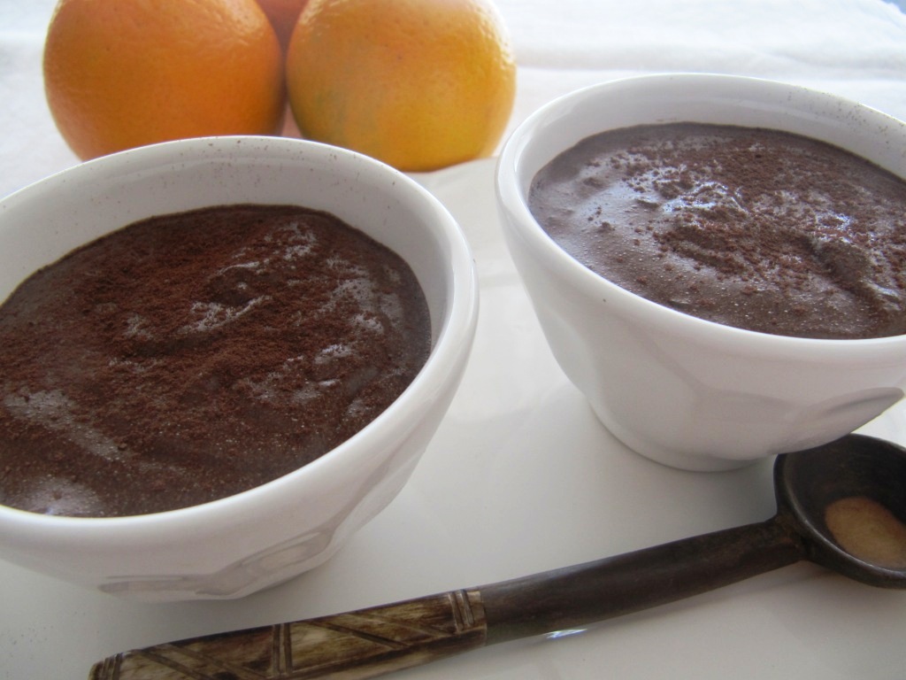 Derreter o chocolate com as natas em banho-maria, mexendo até ficar bem dissolvido. Deixar arrefecer por cinco minutos e juntar a raspa de laranja e o licor. Adicionar as gemas uma de cada vez. Bater as claras em castelo e envolver com cuidado na mistura de chocolate. Distribuir pelas tacinhas ou ramekins (deu-me para cinco) e levar ao frigorífico durante 2 horas. Polvilhar com cacau em pó antes de servir (para a próxima vou tentar ainda outra finalização, talvez algo crocante e caramelizado para pôr por cima...) *Esta não é a receita principal desta página do livro, mas antes uma variação que a autora sugere.