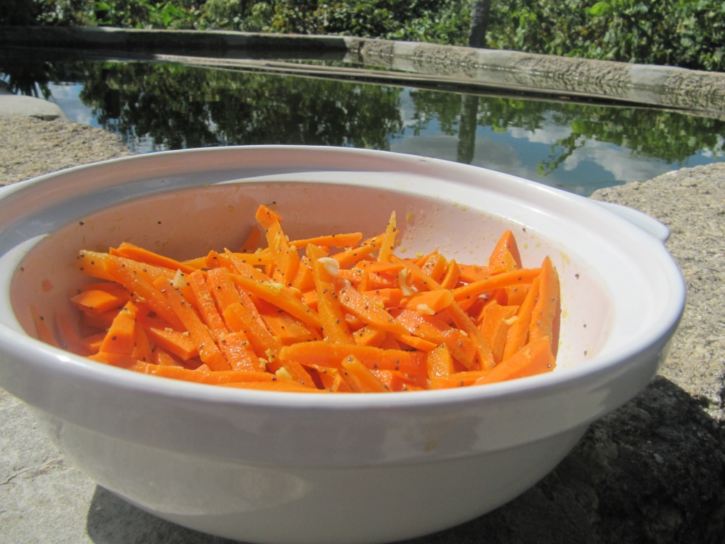 Lavar, secar e descascar as cenouras. Cortá-las em palitos finos com cerca de 5 cm de comprimento para uma taça ou saladeira (ainda pensei ralá-la, mas o crocante iria desaparecer). Juntar o gengibre e o azeite e envolver bem. Levar ao frigorífico cerca de 20 minutos antes de servir para que o aroma e o sabor do gengibre se libertem e a cenoura os possa absorver. Antes de servir, polvilhar com as sementes de papoila e mexer para que se espalhem por toda a salada.