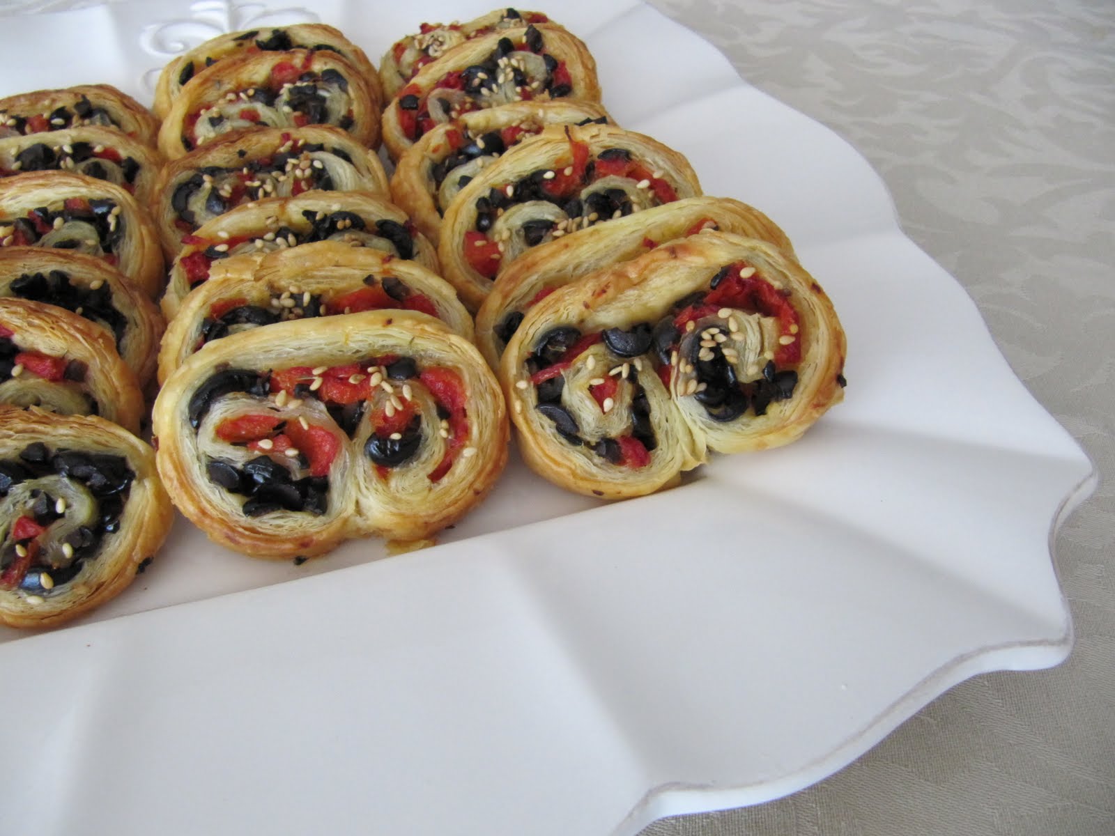 1 placa de massa folhada rectangular 6 colheres de sopa de azeitonas pretas sem caroço picadas (usei do Continente, descaroçadas e às rodelas) 2 pimentos vermelhos grandes assados de conserva (usei do Lidl, em frasco) Azeite aromatizado com orégãos qb (ou azeite e orégãos qb) Sementes de sésamo para polvilhar
