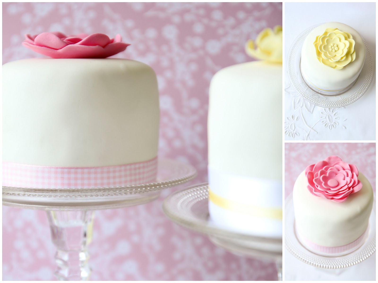 Depois de barrados com ganache de chocolate, para ficarem com um acabamento mais perfeito, cobri-os com a pasta de açúcar e decorei com as flores, também em pasta de açúcar.