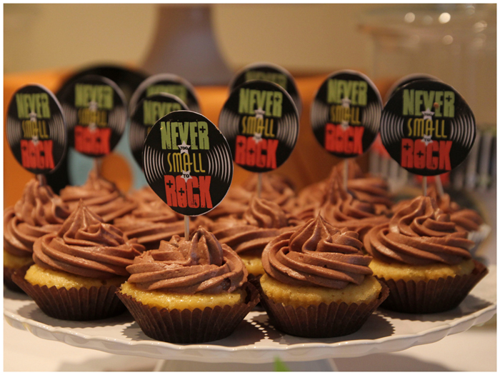 A ideia era fugir dos temas demasiado infantis, até porque o Lucas não tem nenhum boneco ou animal preferido. Quando a mamã Ana me disse que ele adorava música e me mostrou a foto com o body rockeiro, fez-se click nas duas e sabíamos que estava encontrado o tema. Depois, foi só desempoeirar vinis antigos e procurar papéis que combinassem com as cores dos discos, enquanto a mamã Ana desenvolvia, com a sua amiga designer Sofia Oliveira, as etiquetas, os toppers dos cupcakes e os cartões para as embalagens das bolachas.