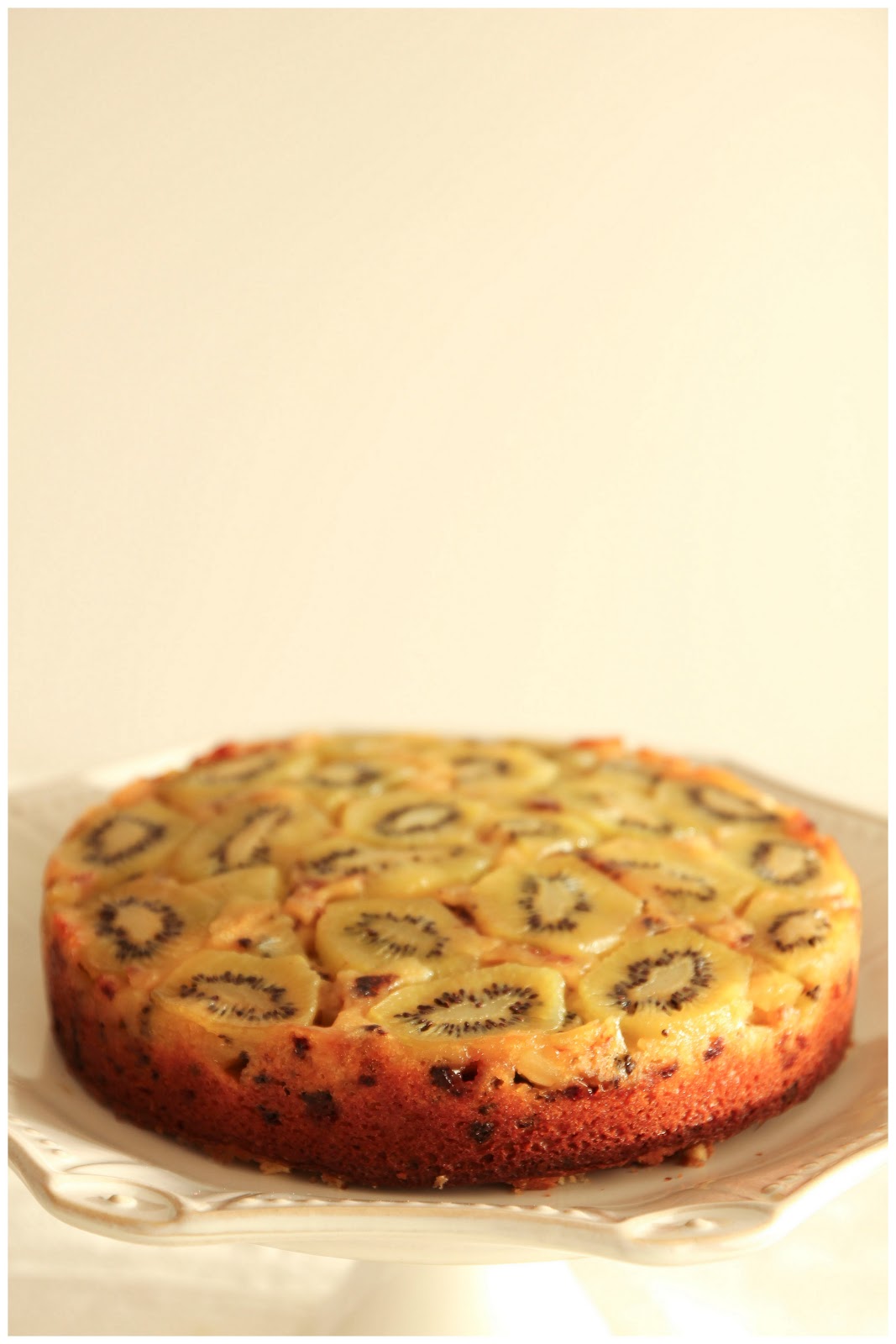 Os kiwis têm chegado cá a casa em quantidades generosas, vindos do quintal dos meus pais. Este ano não só há muitos, como são especialmente saborosos. Mesmo assim, comê-los ao natural não chega para escoá-los e se há coisa que eu não consigo comer são kiwis demasiados maduros. Já há muito que queria experimentá-los num bolo e pela sua forma e textura achei que ficariam bem numa receita de bolo invertido, tipo aqueles típicos dos anos 80 feitos com ananás e caramelo.