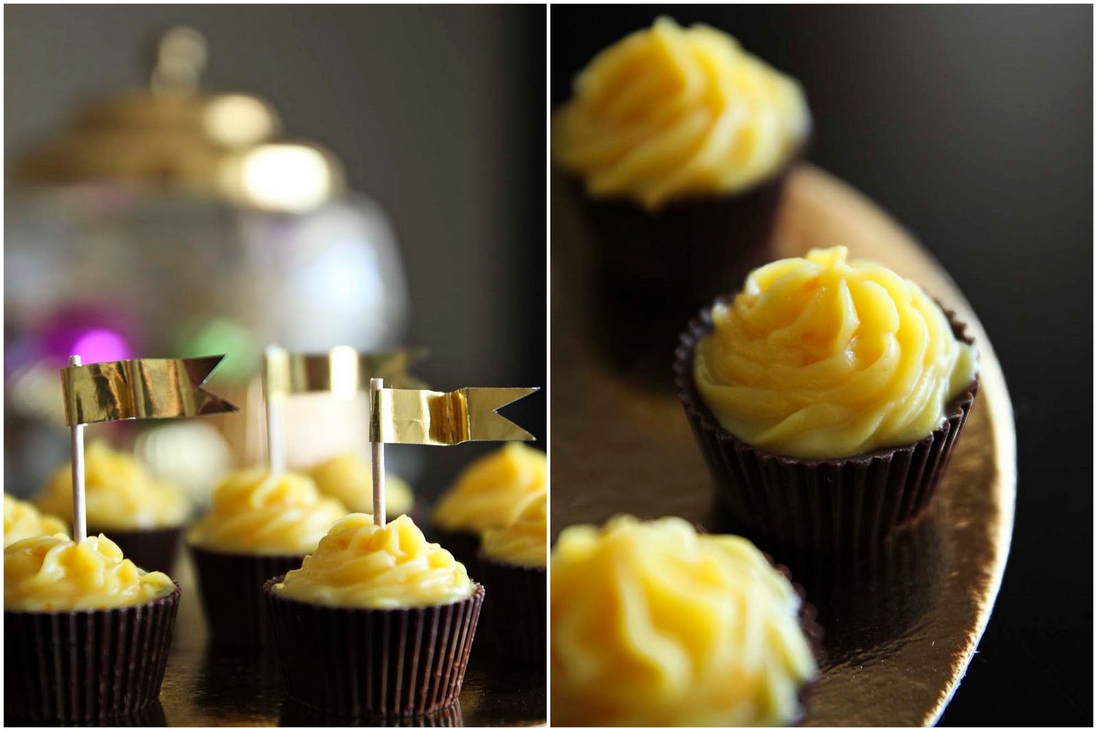 Chocolate and orange microcupcakes For about 16 16 little chocolate cases * 1 batch of orange curd or other filling Pastry bag and star-shaped tip Orange curd: Zest of 1 orange 150 ml of orange juice 1/2 cup of sugar 2 eggs 1 teaspoon cornstarch 45 g of butter or margarine In a saucepan, mix well all the ingredients, except cornstarch and butter, and cook them over medium heat, stirring constantly until it starts to get thick (about 10/15 minutes). Take a tablespoon of the curd into a little bowl and add the teaspoon of cornstarch, giving it a good stir. Pour this mixture into the pan again and keep stirring until thickened (about five minutes). Remove from the heat and add the butter in small pieces. Stir until the butter is well melted and dissolved. Pour into a jar, let cool and store in the fridge at least 12 hours before use. Arrange the little chocolate cases on a serving plate, fill the pastry bag with the orange curd and fill the chocolate cases with it. Keep them in the fridge if not serving immediately. * I took a shortcut and bought them here. But they can also be made at home: melt dark chocolate, fill little silicone cases with the melted chocolate and immediately remove the excess, leaving only the bottom and the sides of the cases coated. Let dry in the fridge and repeat with more melted chocolate to thicken the chocolate case. When dried, remove the silicon case carefully.